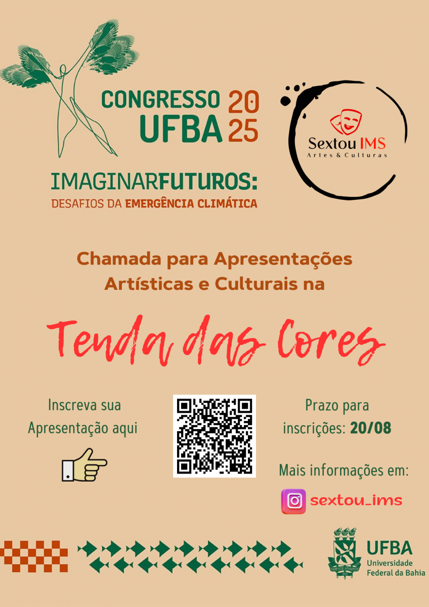 A Tenda das Cores convida artistas, coletivos e criadores de todas as linguagens artísticas a ocuparem nosso espaço com suas ideias, formas e afetos! Se você desenvolve exposições, performances, intervenções urbanas, expressões poéticas, ações interativas ou experiências sensoriais, essa chamada é para você. Nossa Tenda estará funcionando nos dias 03 e 04/09 no Congresso UFBA 2025, Campus da UFBA de Vitória da Conquista