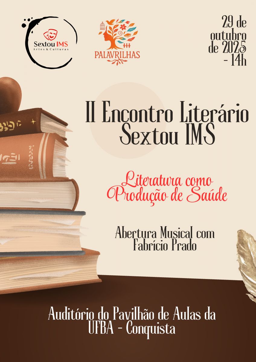 No dia 29 de Outubro às 14hs, o Coletivo Sextou IMS - Artes & Culturas, em parceria com a Comunidade Palavrilhas irão realizar o II Encontro Literário Sextou IMS cujo tema geral será Literatura como Produção de Saúde, com a presença de escritores da comunidade interna e externa da UFBA. Teremos uma Abertura Musical com Fabrício Prado, Cantor e Técnico-Administrativo da UFBA – Conquista. Na oportunidade iremos partilhar de um encontro com a força poética das palavras, além de poder dialogar com os escritores e suas obras. Será um momento especial de diálogo e aprendizado coletivo sobre a criação literária em nossa cidade e a formação de um público leitor e escritor. Desejamos que a comunidade interna da UFBA - Conquista e externa da sociedade conquistense se façam presentes para mais um encontro rico de partilha sobre as potencialidades da escrita e da leitura. O encontro é aberto e gratuito e todos estão convidados para celebrar mais uma vez as artes e as culturas no IMS/CAT!
